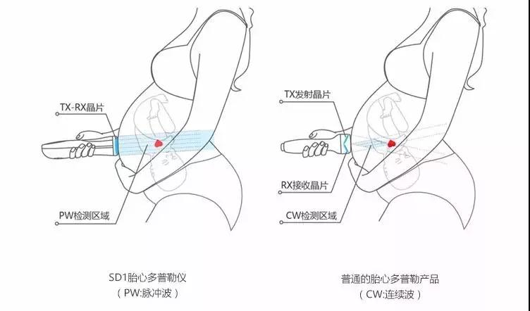 目前,市面上大部分胎心多普勒產(chǎn)品采用連續(xù)波工作模式,它的缺點是檢測面積小,尋找胎心耗時。為了便于普通用戶快速地找到胎心的位置,SD1胎心多普勒儀創(chuàng)新性地采用了單晶片脈沖波前沿技術(shù),降低找胎心角度要求,提升胎心檢測面積,幫助用戶快速尋找胎心。準媽媽們再也不用擔心因為“技術(shù)”不行,找不到胎心啦!
