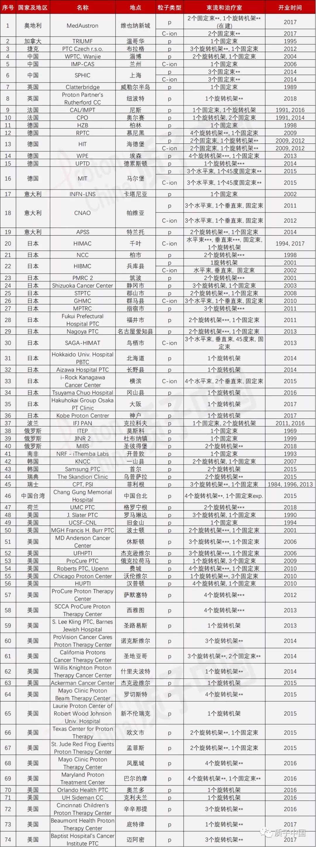 附:全球已運(yùn)營(yíng)質(zhì)子重離子治療中心匯總表(截至2018年7月)