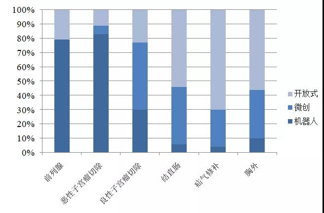 1、國(guó)內(nèi)手術(shù)機(jī)器人在泌尿外科、普外科、胸外科、婦產(chǎn)科及心臟外科的臨床應(yīng)用不斷提升;