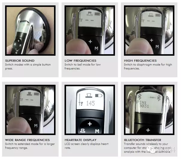 2009年,電子聽診器的發(fā)展達(dá)到了新的巔峰,Littmann®3200型電子聽診器(上圖)出現(xiàn)在世人面前。這是首個運(yùn)用藍(lán)牙技術(shù)的電子聽診器,它能夠?qū)⑿呐K、肺部和其他身體器官的信號無線傳送到醫(yī)師使用的電腦,并通過Cardioscan軟件實(shí)時地將聲音曲線顯示在電腦屏幕上,更準(zhǔn)確地揭示患者心臟可能存在的異?,F(xiàn)象。隨后,軟件會對聲波曲線進(jìn)行分析,并將代表有害雜音的異常部分的細(xì)節(jié)突出顯示出來。醫(yī)師能夠?qū)⒒胤潘俣冉档鸵话雭砀屑?xì)地分析問題,還能將文件保存到患者的檢查結(jié)果中,并通過電子郵件和Scope to Scope遠(yuǎn)程聽診軟件,將其發(fā)送給心臟病專家來確認(rèn)診斷結(jié)果。這套系統(tǒng)不僅能夠準(zhǔn)確捕捉到危險的雜音,還能減少更為昂貴心電圖檢查費(fèi)用和不必要的心臟病專家的診療工作。從此傳統(tǒng)的電子聽診器變成了先進(jìn)的醫(yī)療工具,取代了醫(yī)師對心臟雜音的猜測,提高了診斷能力。隨后3M公司推出了一系列改良產(chǎn)品......目前這方面3M公司的最新產(chǎn)品是Littmann4100系列(下圖)