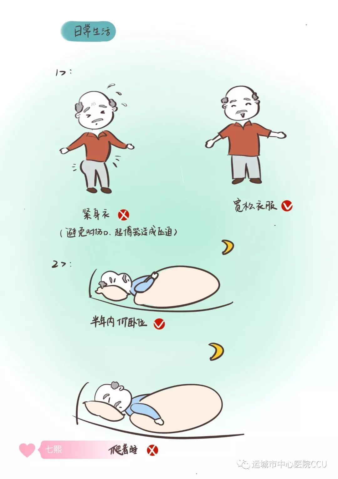 應穿著寬松衣物、休息時保持仰臥位或側臥位,避免爬下睡對起搏器造成壓迫。